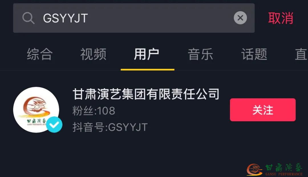 方式一: 下載手機“抖音”APP 打開軟件 點擊搜索 輸入“甘肅演藝集團”或輸入抖音號“GSYYJT” 搜索用戶 點擊“關(guān)注” 方式二: 將下圖抖音碼保存至手機相冊 打開抖音,點擊搜索后找到左上角掃一掃圖標 點擊相冊,選擇保存的抖音碼圖片,進入甘肅演藝集團抖音號,點擊關(guān)注即可 敬請廣大觀眾朋友們關(guān)注我們,一起了解甘肅演藝集團精品劇目的獨特魅力!如果您有想要觀看的內(nèi)容,請在公眾號下方或抖音評論區(qū)留言,我們將以獨特的視角,滿足觀眾朋友們的視聽感覺!
