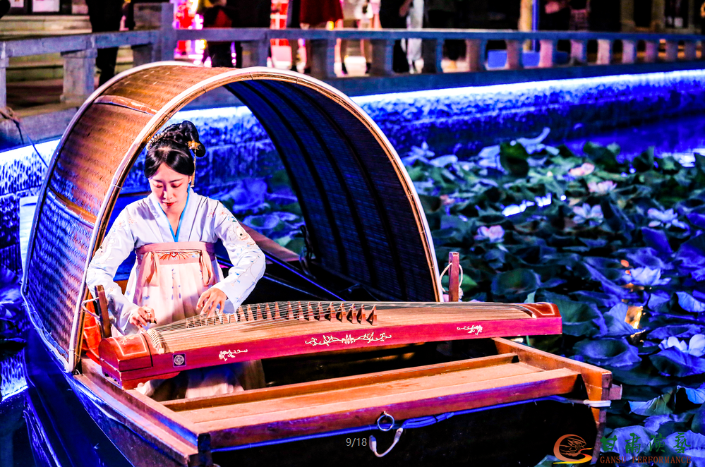 在國潮有范和大美東方區(qū)域,中國傳統(tǒng)樂器在老街亭臺樓閣內(nèi)小橋流水中箏弦合鳴。甘肅演藝集團的樂手們,以傳統(tǒng)民樂為主,又將國潮流行音樂用傳統(tǒng)樂器演奏形式精心改編,體現(xiàn)老街一街千面面面具色的特點,無論獨奏還是和鳴,每場曲目不一但首首精彩,琴聲合奏好像水泉冷澀琵琶聲開始凝結(jié),凝結(jié)而不通暢聲音漸漸地中斷,仿佛江南水鄉(xiāng)伊人在水一方。