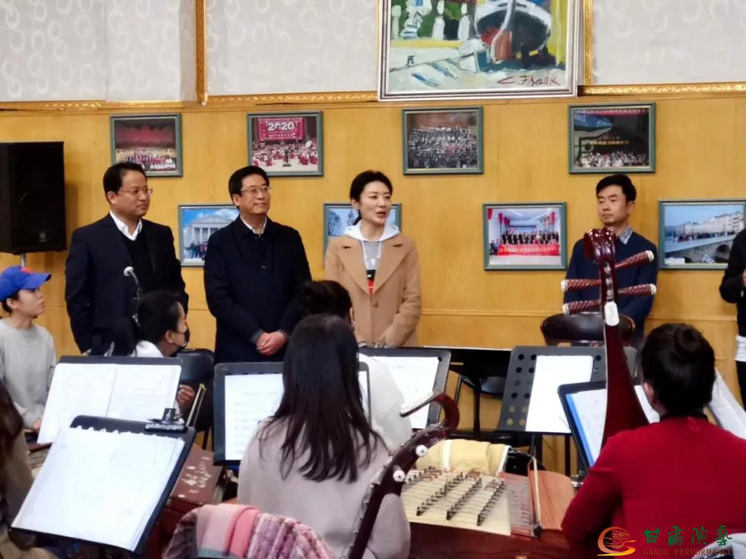 周濤一行首先來到民族樂團(tuán)排練廳,甘肅演藝集團(tuán)黨委書記、董事長(zhǎng)陳其銀及歌舞劇院院長(zhǎng)李金江向周濤介紹民族樂團(tuán)的藝術(shù)生產(chǎn)情況,并觀看樂團(tuán)及唱隊(duì)聯(lián)排舞劇《絲路花雨》經(jīng)典音樂片段,周濤對(duì)排練給予高度評(píng)價(jià),動(dòng)情的說:“在我中學(xué)時(shí)期第一次觀看《絲路花雨》電影版時(shí)就被這一全新的藝術(shù)表演所震撼,剛剛音樂一響我一下就熱淚盈眶,難以想象在四十多年前,前輩們是有多大的創(chuàng)新精神才能在改革開放初期創(chuàng)作出這樣難能可貴的集多民族元素于一體的藝術(shù)作品,在我看來《絲路花雨》就是一座藝術(shù)豐碑,各位能夠演唱和演奏是一種榮譽(yù),大家排練的濃厚藝術(shù)氛圍也讓我肅然起敬!