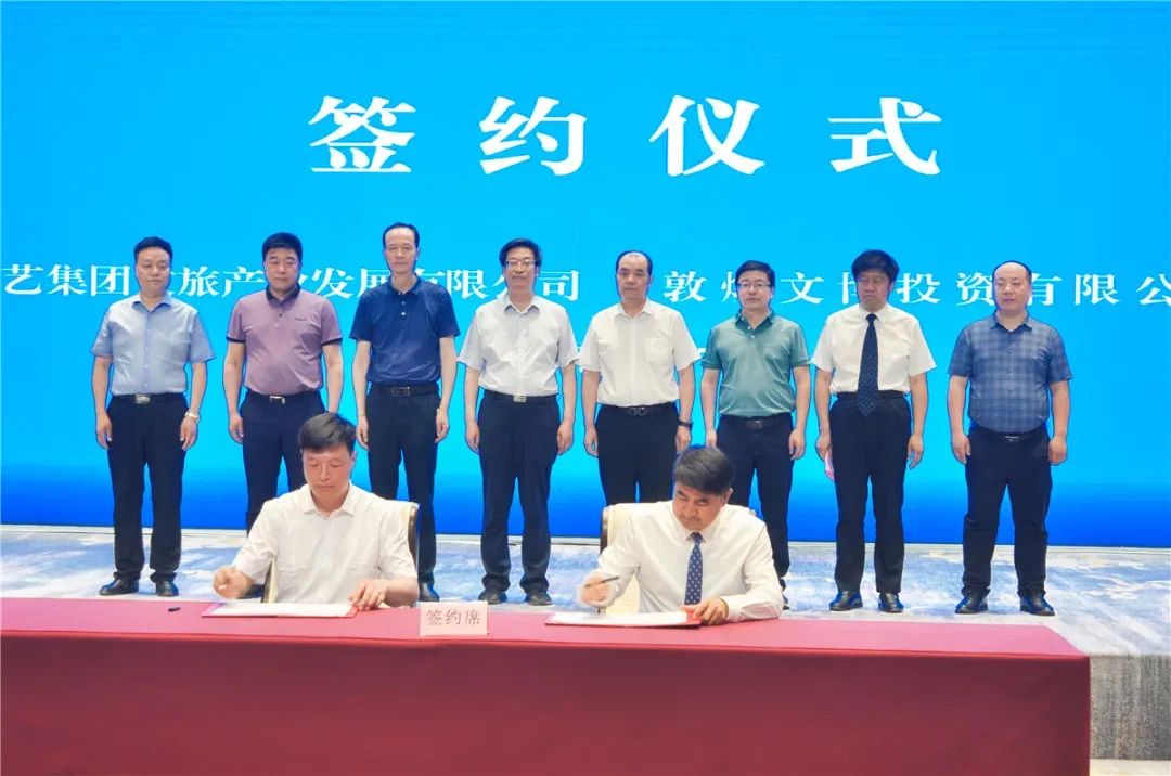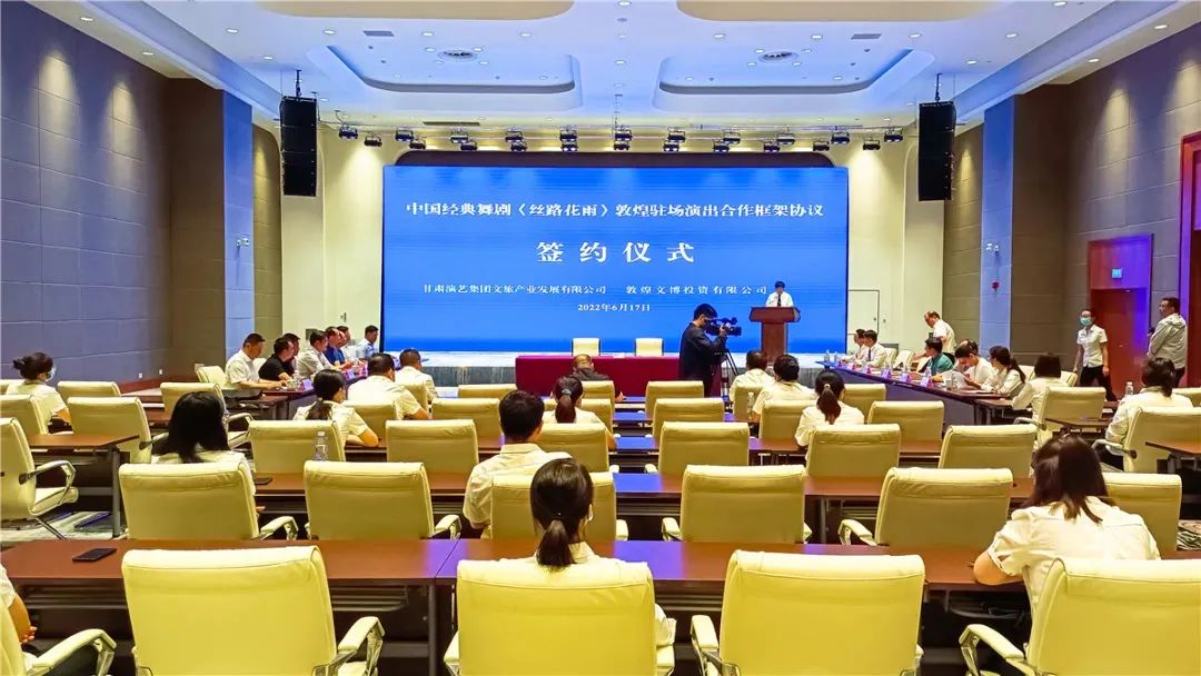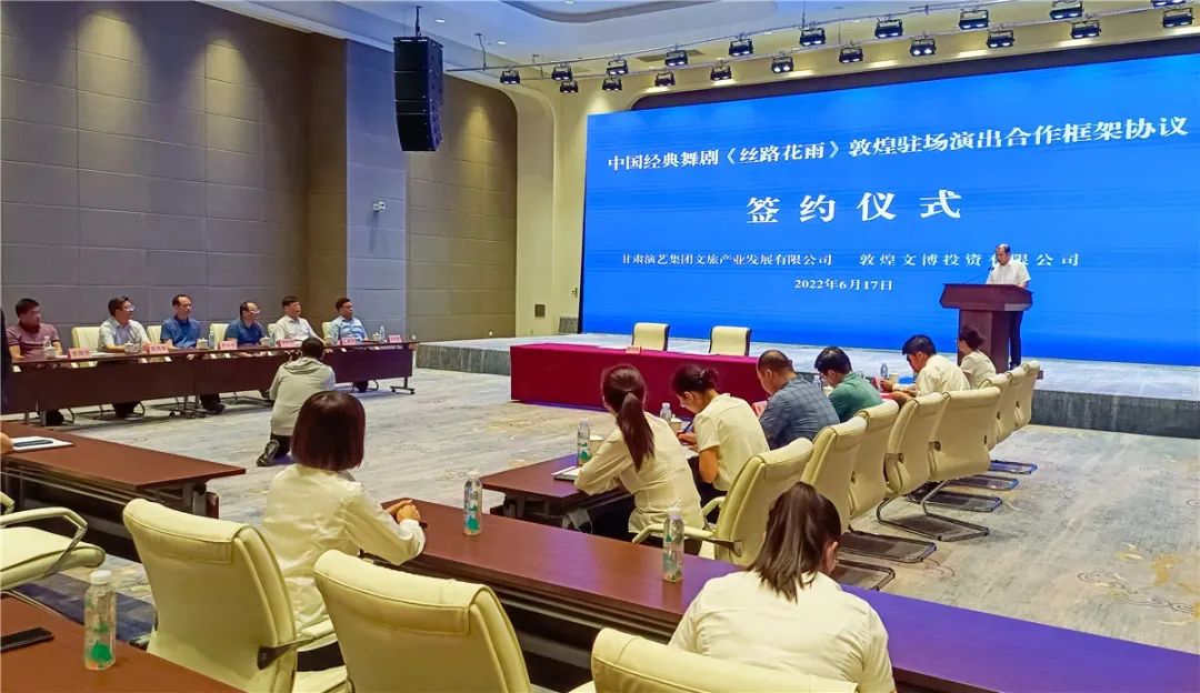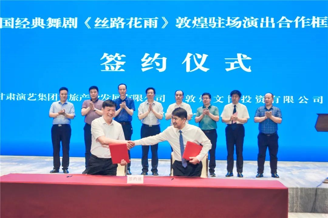 6月17日,甘肅演藝集團(tuán)文旅產(chǎn)業(yè)發(fā)展有限公司和敦煌文博投資有限公司在敦煌國(guó)際會(huì)展中心聯(lián)袂舉行中國(guó)經(jīng)典舞劇《絲路花雨》敦煌駐場(chǎng)演出簽約儀式。敦煌市政府副市長(zhǎng)路育剛,敦煌市文旅局黨組書(shū)記、局長(zhǎng)陳錦業(yè),敦煌市財(cái)政局黨組書(shū)記、局長(zhǎng)周東,敦煌市國(guó)資運(yùn)營(yíng)中心主任王海云,敦煌文博投資有限公司黨組織書(shū)記、提名董事長(zhǎng)孫雪虎 ,以及甘肅演藝集團(tuán)黨委書(shū)記、董事長(zhǎng)陳其銀,黨委副書(shū)記、總經(jīng)理劉小承等領(lǐng)導(dǎo)出席了當(dāng)天的簽約儀式。