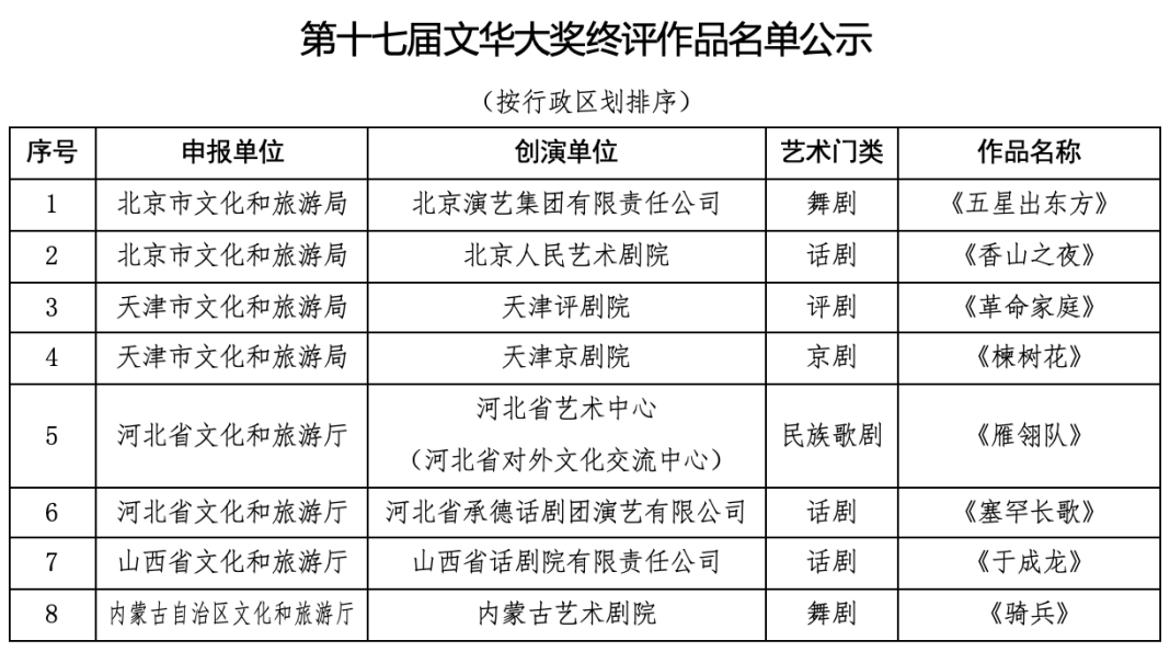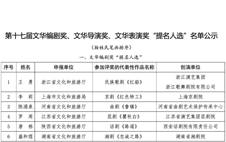 根據(jù)《中國文化藝術(shù)政府獎——文華獎?wù)鲁獭贰吨袊幕囆g(shù)政府獎——第十七屆文華獎評獎辦法》有關(guān)規(guī)定,現(xiàn)將第十七屆文華大獎終評作品名單和第十七屆文華編劇獎、文華導(dǎo)演獎、文華表演獎“提名人選”名單予以公示(第十七屆文華音樂創(chuàng)作獎、文華舞臺美術(shù)獎無“提名人選”)。入圍終評的作品和“提名人選”所對應(yīng)的作品應(yīng)參加第十三屆中國藝術(shù)節(jié)現(xiàn)場演出,不能參加者視為自動放棄評獎資格。