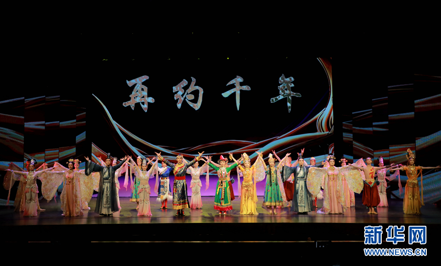 圖為演員在《相約千年》中表演。新華網(wǎng)發(fā)(劉欣瑜 攝) 圖為《相約千年》演出結(jié)束,全體演員謝幕。新華網(wǎng)發(fā)(劉欣瑜 攝)