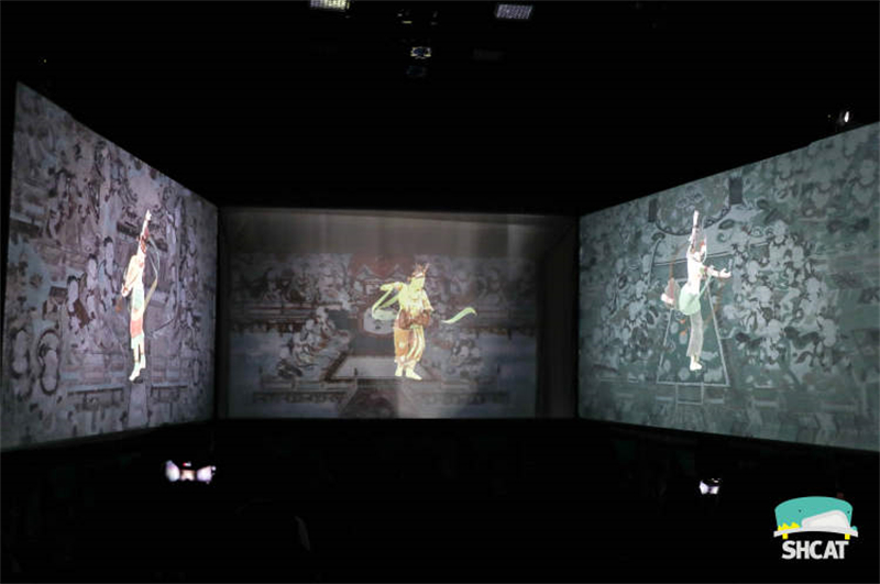 其中,藝術(shù)周特別邀請(qǐng)了由徐匯藝術(shù)館、敦煌研究院主創(chuàng)、上海左左多媒體工作室制作的多媒體石窟影像展《敦煌樂舞》前來(lái)展出。為了讓小朋友有身臨其境的奇妙體驗(yàn),該展覽以盛唐、中唐時(shí)期的敦煌壁畫為題材,運(yùn)用技術(shù)復(fù)原人物形象,由真人動(dòng)作捕捉技術(shù)提取舞蹈動(dòng)作;音樂則選用觀無(wú)量壽經(jīng)變中的樂器配置,并進(jìn)行了專門的創(chuàng)作,帶領(lǐng)觀眾領(lǐng)略多媒體技術(shù)與千百年前的敦煌藝術(shù)審美發(fā)生的神奇碰撞。