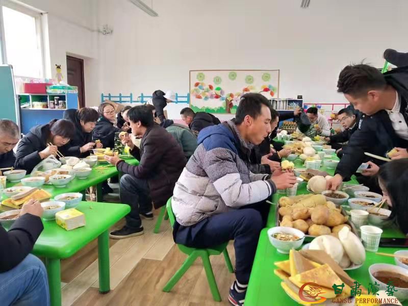 在本次演出期間,恰逢初冬,天寒變化無常,在演出中,演職人員冒著刺骨寒風(fēng),在四處漏風(fēng)的簡易舞臺上,身著單薄演出服裝精益求精地為當(dāng)?shù)厝嗣袢罕娧莩?。由于連續(xù)奔波,無法按時就餐,當(dāng)?shù)厝嗣袢罕娋驮谖枧_邊架起一口大鍋煮上洋芋、玉米,演出人員在演出間隙在舞臺旁的“幼兒園”小教室充充饑,大家稱之為“甘秦人吃的是老百姓的綠色食品,我們報答人民的是精神食糧”。