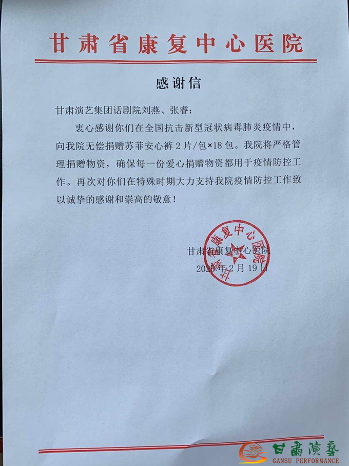 在抗擊疫情的特殊時(shí)期,話劇院舞美工程部化妝師劉燕、張睿兩位同志,一直心系一批批甘肅支援武漢的醫(yī)護(hù)人員,經(jīng)過兩位同志一直細(xì)心關(guān)注新聞媒體關(guān)于特殊時(shí)期醫(yī)護(hù)人員的工作報(bào)道,兩位同志決定將自行購買的女士用品“安心褲”捐贈給甘肅支援武漢的女性醫(yī)護(hù)人員?!拔覀兿耄t(yī)護(hù)人員被不透氣的防護(hù)服包裹,為了提高醫(yī)護(hù)效率,醫(yī)護(hù)人員們穿著成人的尿不濕,女性醫(yī)護(hù)人員在生理特殊期時(shí)怎么辦?我們就決定將不多的幾包“安心褲”轉(zhuǎn)交給甘肅支援武漢的女性醫(yī)護(hù)人員”,劉燕真情實(shí)意地表達(dá)著。當(dāng)劉燕和張睿聯(lián)系到甘肅省康復(fù)中心醫(yī)院護(hù)士部主任后,她們兩將湊到一起的幾包“安心褲”于2月19日中午親手交給甘肅省康復(fù)中心醫(yī)院一位姓陳的主任手中。這份愛心善舉,給予即將支援武漢的第六批醫(yī)護(hù)人員動力和信心,甘肅省康復(fù)中心醫(yī)院向兩位同志回復(fù)了感謝信,看著感謝信劉燕輕輕的說:“醫(yī)院這么忙,我們沒有想到有感謝信,能做點(diǎn)啥就行”。疫情無情人有情,兩位同志心系一線醫(yī)護(hù)人員,看似平凡,卻彰顯人間大愛的善舉,譜寫著眾志成城的真情和聲。