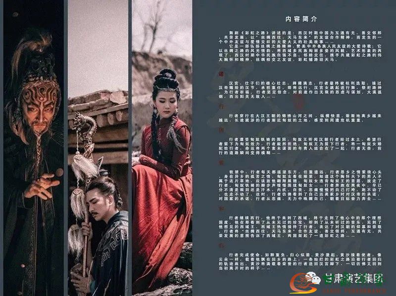 甘肅演藝集團歌舞劇院創(chuàng)排的舞劇《彩虹之路》,以絲綢之路的風光情韻,將西域多民族絢麗多姿的風貌,藝術形象的再現(xiàn)了中國民族自強不息,鄰睦交往,攜手共建彩虹之路的偉大胸懷和精神,是一部弘揚絲綢之路精神,贊美中外各族人民友誼的大愛詩歌。