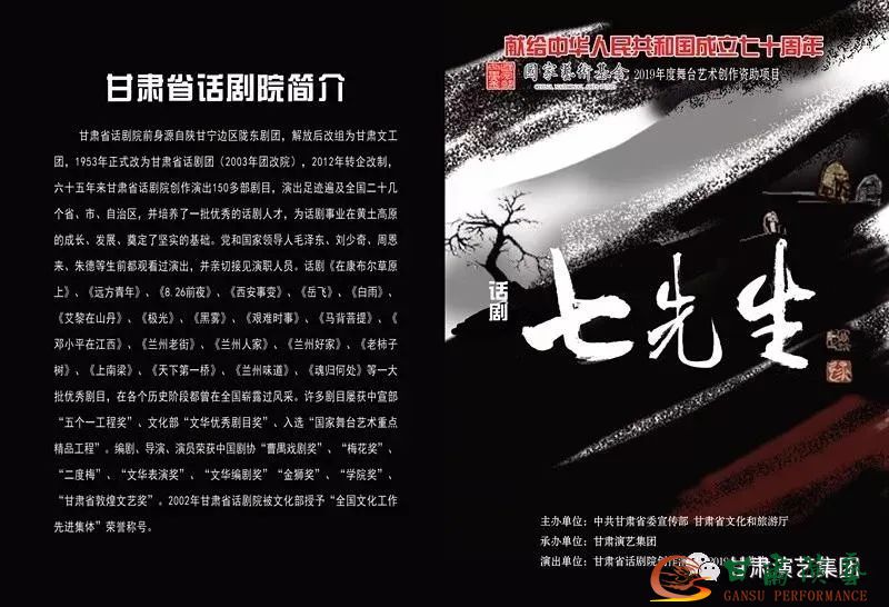 甘肅演藝集團話劇院創(chuàng)排的話劇《七先生》是根據(jù)華池縣南梁地區(qū)創(chuàng)建陜甘邊區(qū)蘇維埃政府的歷史事件為創(chuàng)作藍本;以陜甘邊區(qū)人民群眾中的具有典型性和現(xiàn)實意義的人物,作為劇中主要人物形象的塑造,深入挖掘和重點表現(xiàn)陜甘邊區(qū)人民群眾在紅色政權執(zhí)政為民的感召下,精神層面的徹底覺醒——只有中國共產黨領導的蘇維埃政府,才是真正為人民謀利益的政府。只有中國共產黨才能救中國。