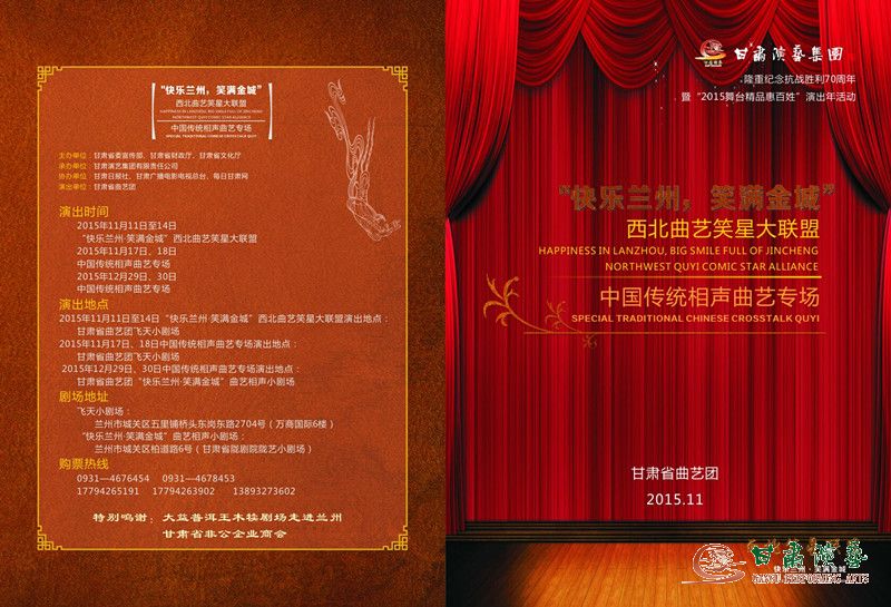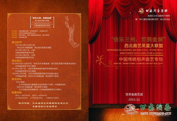 1. 2015年11月11日至14日“快樂蘭州·笑滿金城”西北曲藝笑星大聯(lián)盟演出地點(diǎn):甘肅省曲藝團(tuán)飛天小劇場