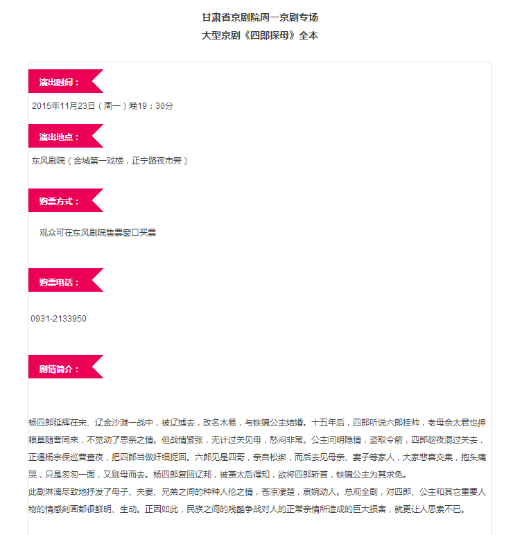 甘肅省京劇院周一京劇專場(chǎng)《四?探母》全本演出預(yù)告