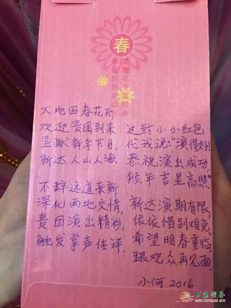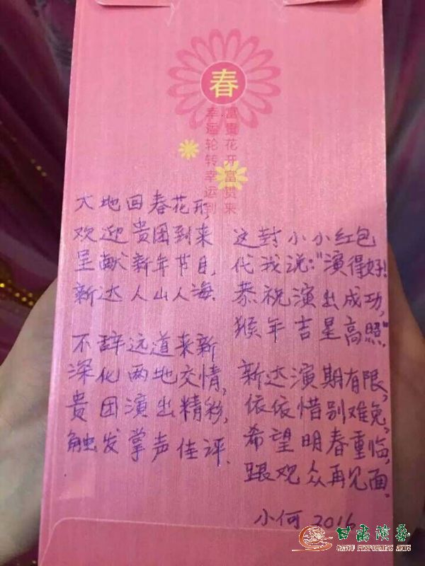 值得一提的是,這些紅包上均帶有新加坡市民的漢字祝福。其中一位署名為“小何”的市民,用六言打油詩寫的祝福語格外引人注目,他寫道“大地回春花開,歡迎貴團到來。呈現(xiàn)新年節(jié)目,新達人山人海。不辭遠道來新,深化兩地交情。貴團演出精彩,觸發(fā)掌聲佳評。這封小小紅包,代我說聲‘演得好’。恭祝演出成功,猴年吉星高照。新達演期有限,依依惜別難免。希望明春重臨,跟觀眾再見面?!?nbsp;