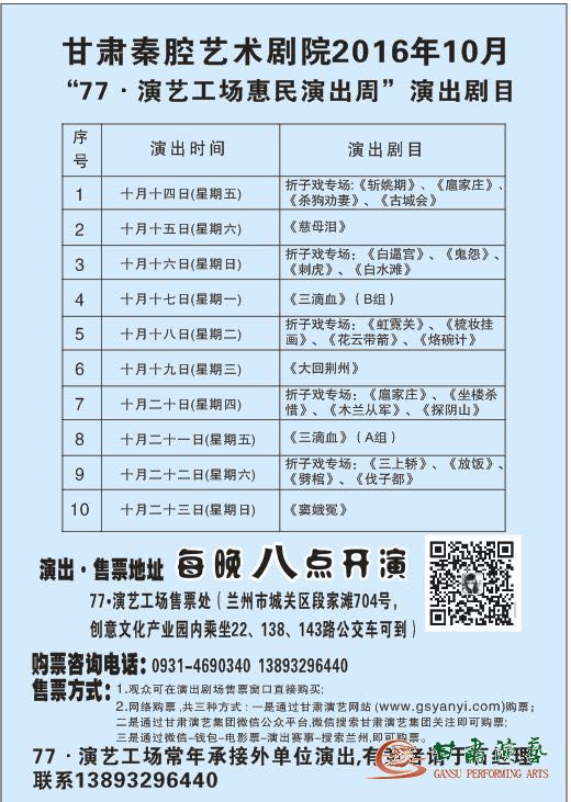 甘肅秦腔藝術劇院于2016年10月14日至10月23日在“77·演藝工場”進行惠民演出周的演出。 在本次惠民演出中,甘肅秦腔藝術劇院將連續(xù)演出秦腔經典傳統(tǒng)劇目《慈母淚》、《三滴血》、《竇娥冤》以及20多本精品折子戲。為金城戲迷和觀眾獻上一道道豐盛的秦腔大餐,讓戲迷和觀眾過足戲癮。 本次演出將于10月23日晚結束,歡迎廣大戲迷和觀眾前來觀看。(圖文由甘肅秦腔藝術劇院提供)