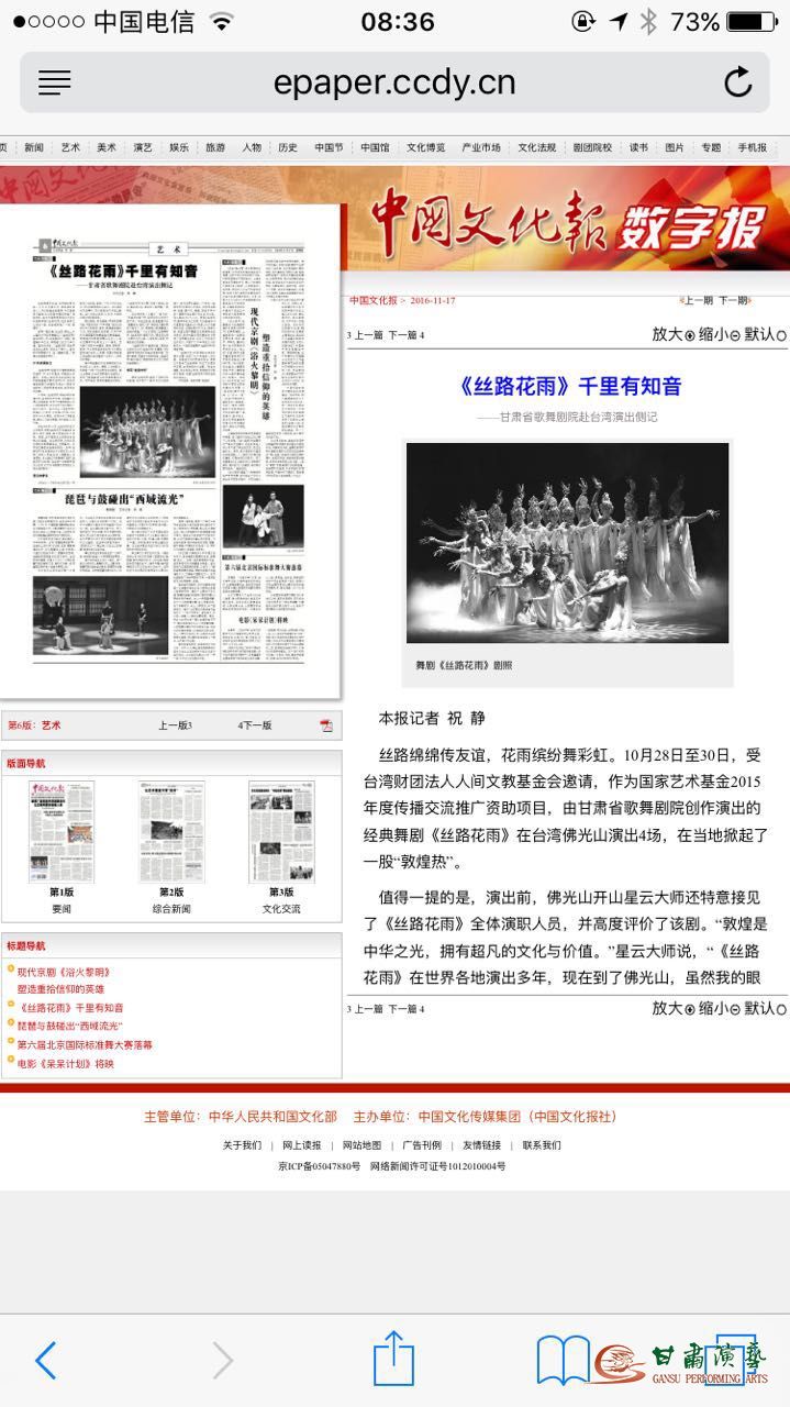 (本報(bào)記者 祝 靜)絲路綿綿傳友誼,花雨繽紛舞彩虹。10月28日至30日,受臺(tái)灣財(cái)團(tuán)法人人間文教基金會(huì)邀請(qǐng),作為國(guó)家藝術(shù)基金2015年度傳播交流推廣資助項(xiàng)目,由甘肅省歌舞劇院創(chuàng)作演出的經(jīng)典舞劇《絲路花雨》在臺(tái)灣佛光山演出4場(chǎng),在當(dāng)?shù)叵破鹆艘还伞岸鼗蜔帷薄?nbsp;