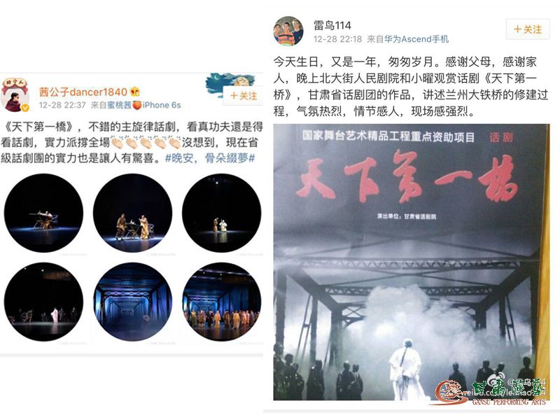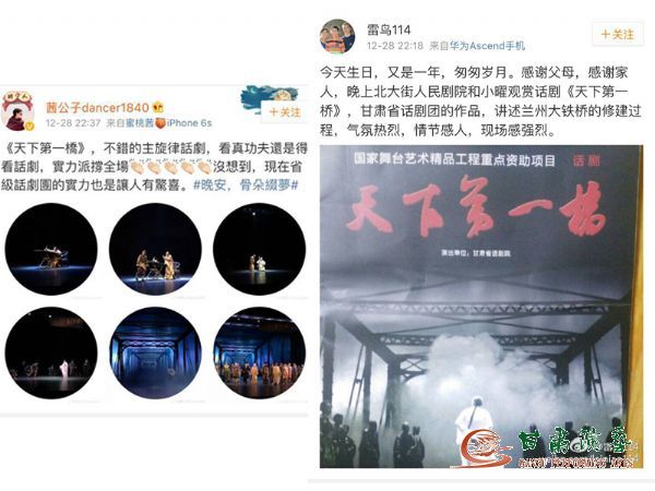 有觀眾在微博評論說:“《天下第一橋》,不錯的主旋律話劇,看真功夫還是得看話劇,實力派撐全場沒想到,現(xiàn)在省級話劇院的實力也是讓人有驚喜?!薄敖裉焐?,又是一年,匆匆歲月。感謝父母,感謝家人,晚上北大街人民劇院和小曜觀賞話劇《天下第一橋》,甘肅省話劇院的作品,講述蘭州大鐵橋的修建過程,氣氛熱烈,情節(jié)感人,現(xiàn)場感強烈。”(圖文由甘肅省話劇院提供)