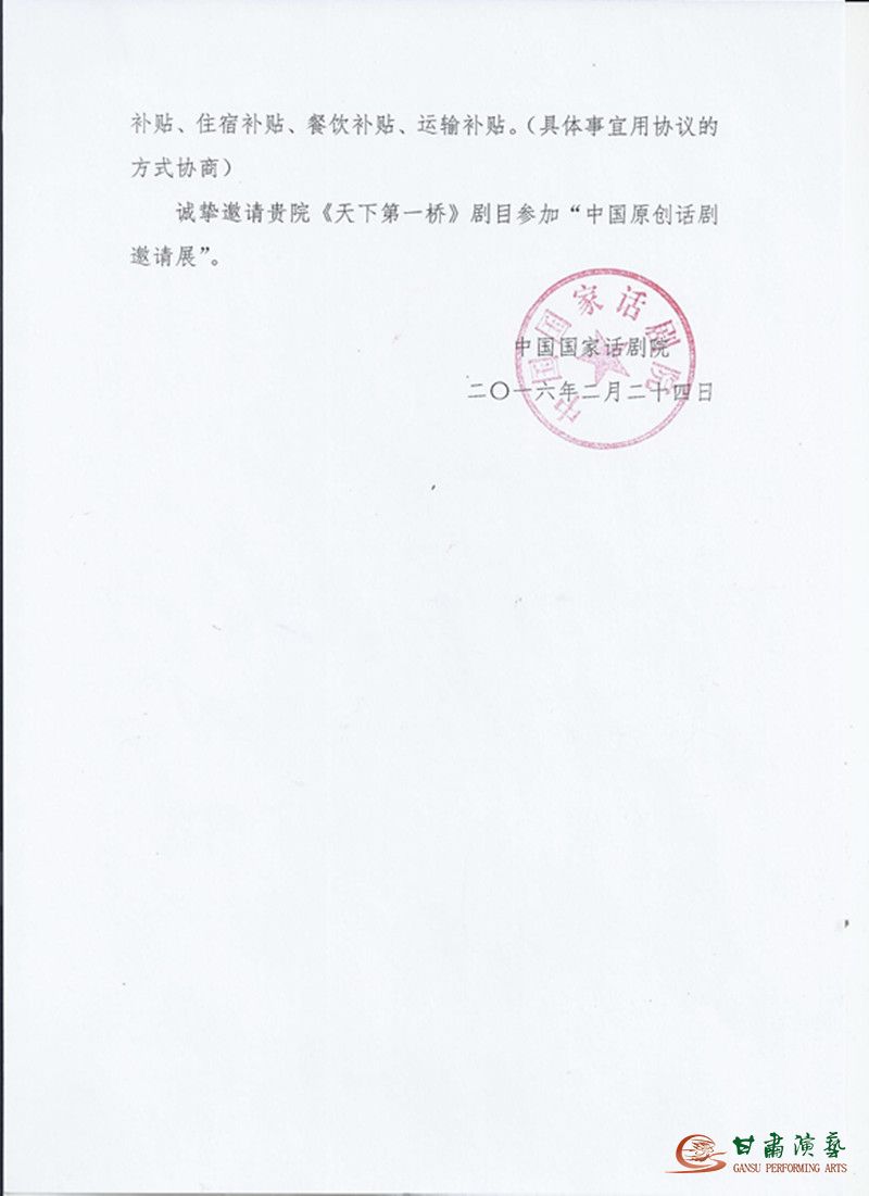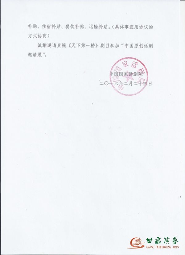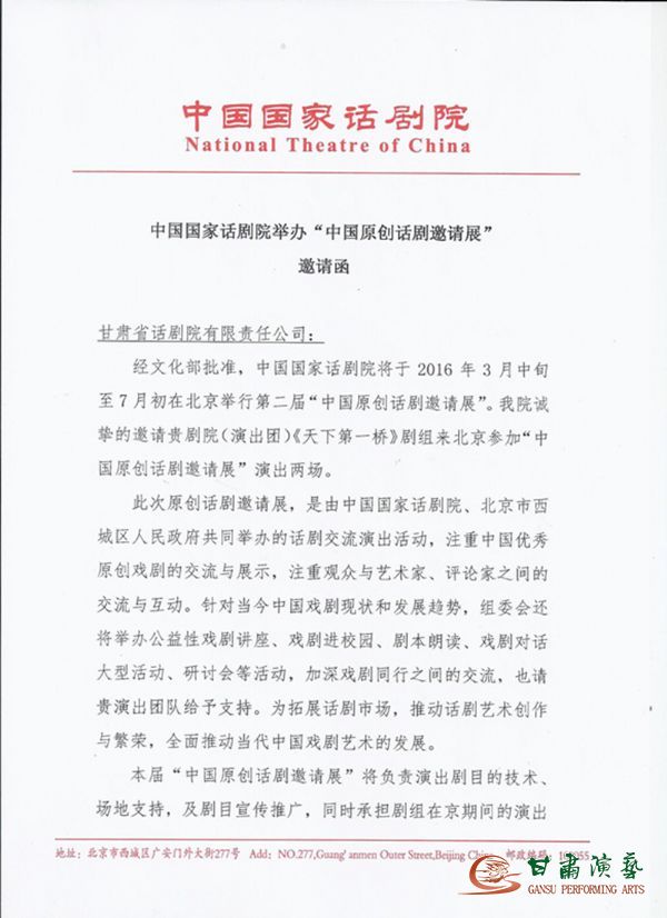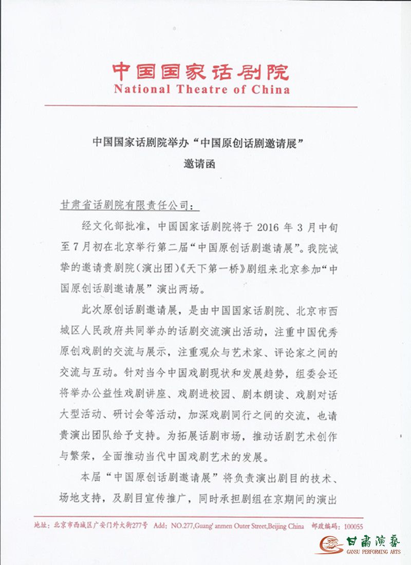 2016年2月29日,甘肅省話劇院收到中國國家話劇院舉辦 “中國原創(chuàng)話劇邀請展”的邀請函。省話劇院原創(chuàng)話劇《天下第一橋》將于5月26、27日在北京演出。(圖文由省話劇院提供)