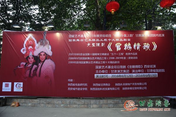 國家藝術(shù)基金2015年度資助項目“絲路行·隴上韻”甘肅演藝集團(tuán)全國巡演項目系列活動之一,《官鵝情歌》6月12日、13日在陜西省戲曲研究院劇場上演,這次國內(nèi)巡演是以絲綢之路主要城市為中心,計劃2016年內(nèi)在全國范圍內(nèi)完成50場公益演出,讓更多的人了解甘肅的文化魅力,感受隴上的藝術(shù)韻味。