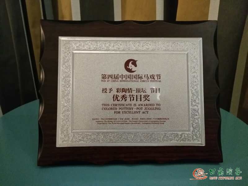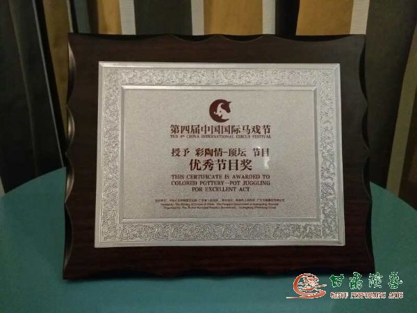 2017年11月22日至25日,甘肅省雜技團情景雜技節(jié)目《彩陶情——頂壇》在珠海參加第四屆中國國際馬戲藝術(shù)節(jié),榮獲“優(yōu)秀節(jié)目獎”。這是西北五省雜技團在“中國國際馬戲藝術(shù)節(jié)”上的首次亮相,并獲得“優(yōu)秀節(jié)目獎”。