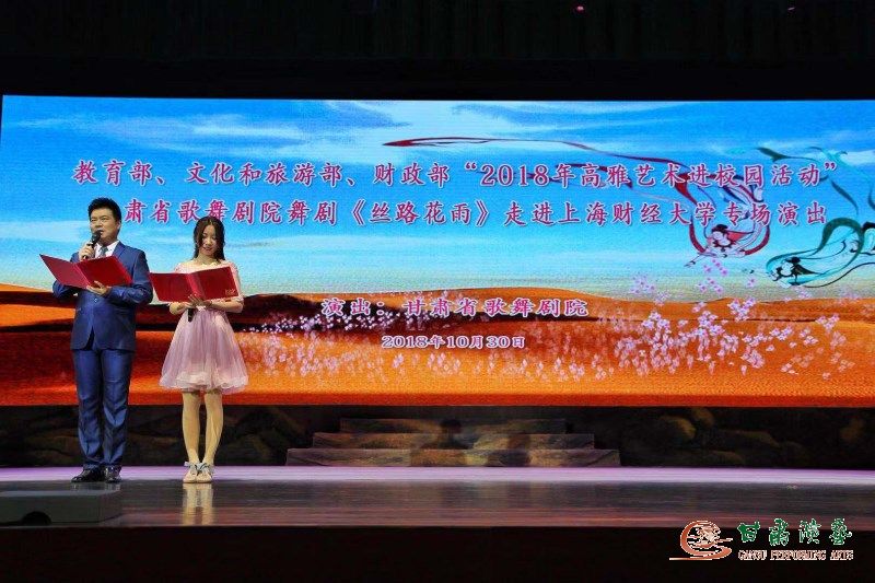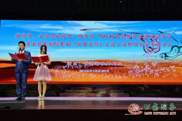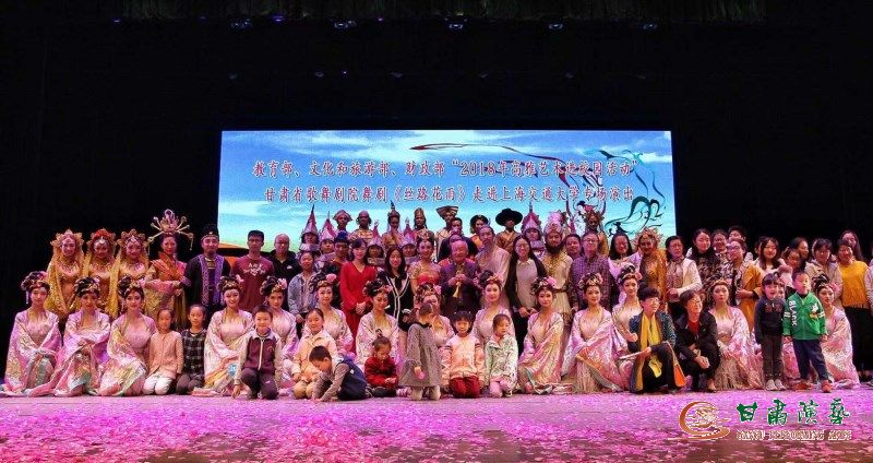 為豐富校園生活,領(lǐng)略中國優(yōu)秀民族文化,感受經(jīng)典藝術(shù),10月29日,甘肅省歌舞劇院攜中國經(jīng)典舞劇《絲路花雨》在上海大學演出之后,又相繼在上海財經(jīng)大學、上海交通大學、上海師范大學隆重上演,舞蹈演員與師生們的舞蹈交流互動和主持人對《絲路花雨》劇情、創(chuàng)排情況的介紹,以及全體演職人員呈現(xiàn)的精彩絕倫演出和久遠動人的絲路敦煌故事讓現(xiàn)場的師生觀眾稱贊不已。