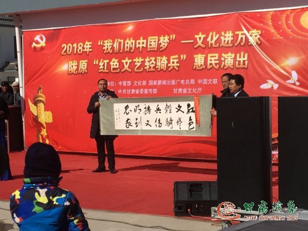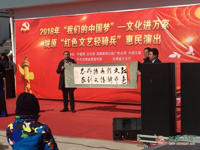 演出開始前,當(dāng)?shù)匦〔泶宓母咐相l(xiāng)親們?yōu)榱烁兄x甘肅省曲藝團(tuán)的到來,送上了一副“紅色文藝輕騎兵傳播文明到農(nóng)家” 的墨寶,讓甘肅省曲藝團(tuán)一眾演職人員頗受感動(dòng)。