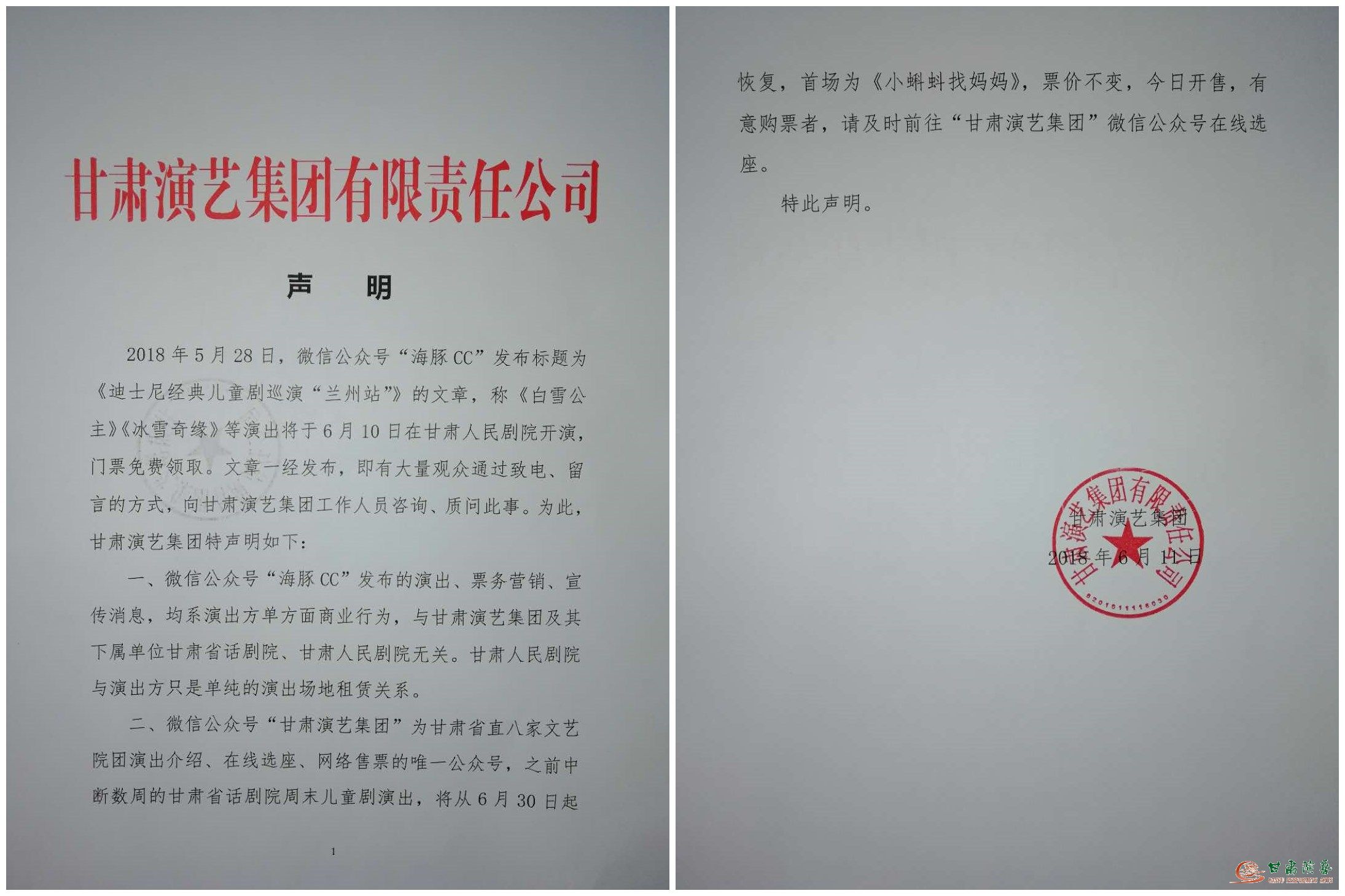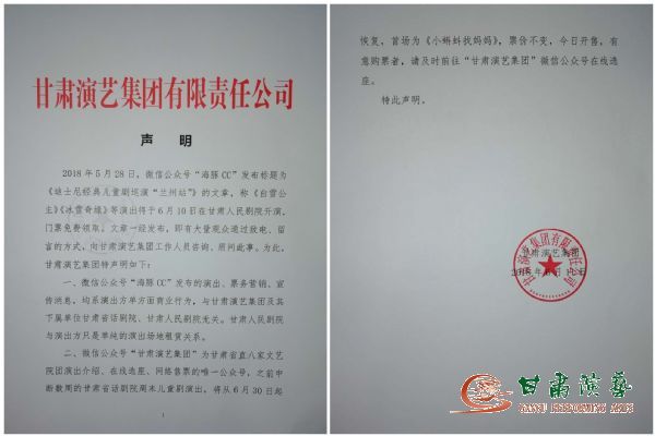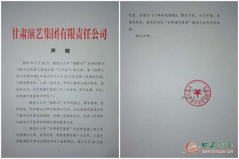 2018年5月28日,微信公眾號(hào)“海豚CC”發(fā)布標(biāo)題為《迪士尼經(jīng)典兒童劇巡演“蘭州站”》的文章,稱《白雪公主》《冰雪奇緣》等演出將于6月10日在甘肅人民劇院開演,門票免費(fèi)領(lǐng)取。文章一經(jīng)發(fā)布,即有大量觀眾通過(guò)致電、留言的方式,向甘肅演藝集團(tuán)工作人員咨詢、質(zhì)問(wèn)此事。為此,甘肅演藝集團(tuán)特聲明如下: