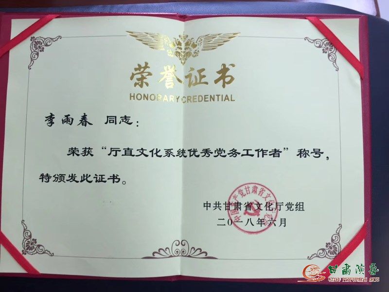 甘肅省京劇團黨總支榮獲“先進基層黨組織”的稱號,李雨春同志獲得“優(yōu)秀黨務(wù)工作者”的榮譽稱號,尤瑞同志榮獲“優(yōu)秀共產(chǎn)黨員”的稱號。