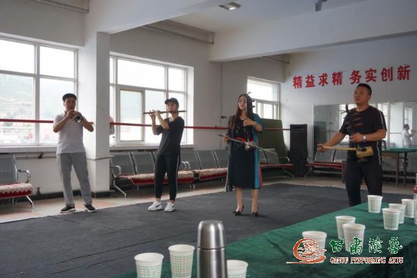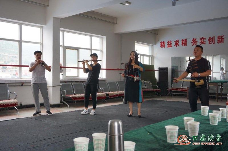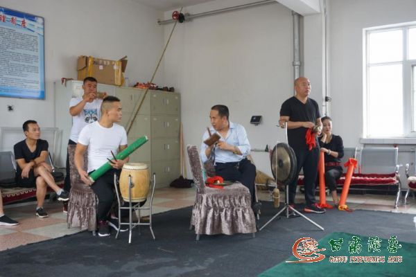 第三日,采風(fēng)隊伍一行人來到環(huán)縣演藝集團,欣賞了地道的“隴東道情”。隴東道情最早是以道家故事為題材,在道觀廟宇進行演唱,其傳統(tǒng)的藝術(shù)形式,多為一人說唱,眾人幫唱,說唱相間,以唱為主。藝人懷抱漁鼓、手執(zhí)簡板,說唱環(huán)境不受任何場地限制,田間地頭、庭舍院落均可說唱。