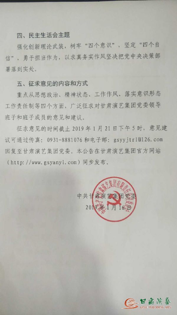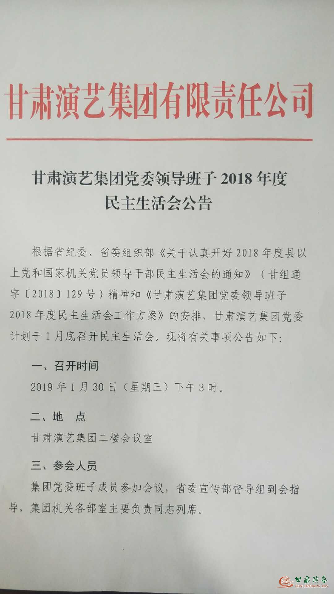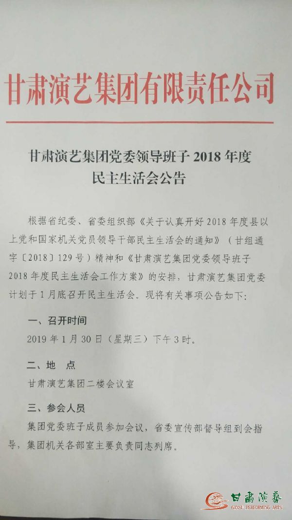 甘肅演藝集團(tuán)黨委領(lǐng)導(dǎo)班子2018年度民主生活會(huì)公告