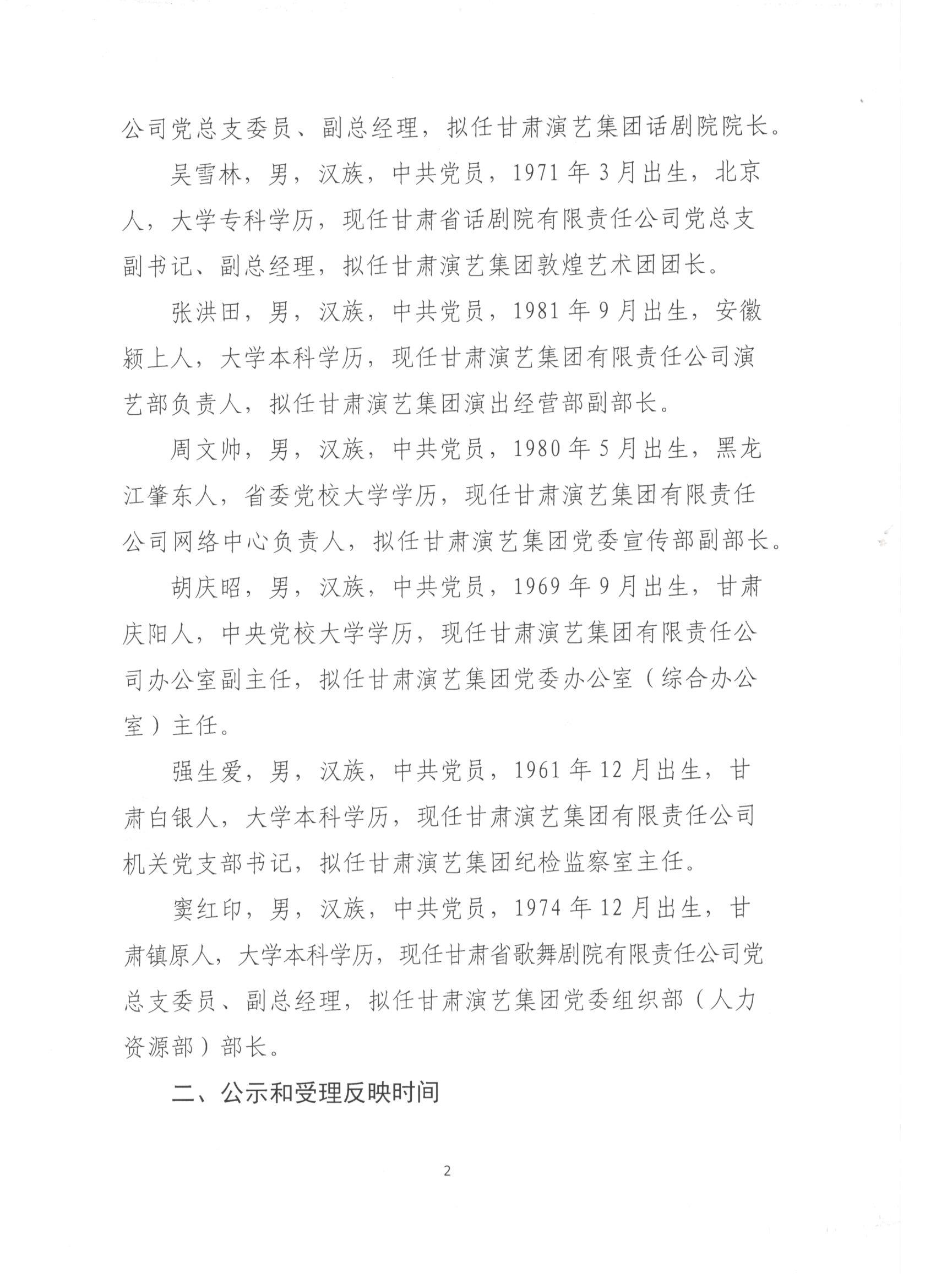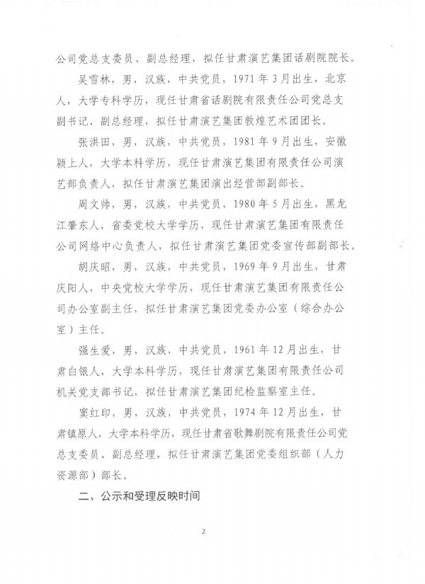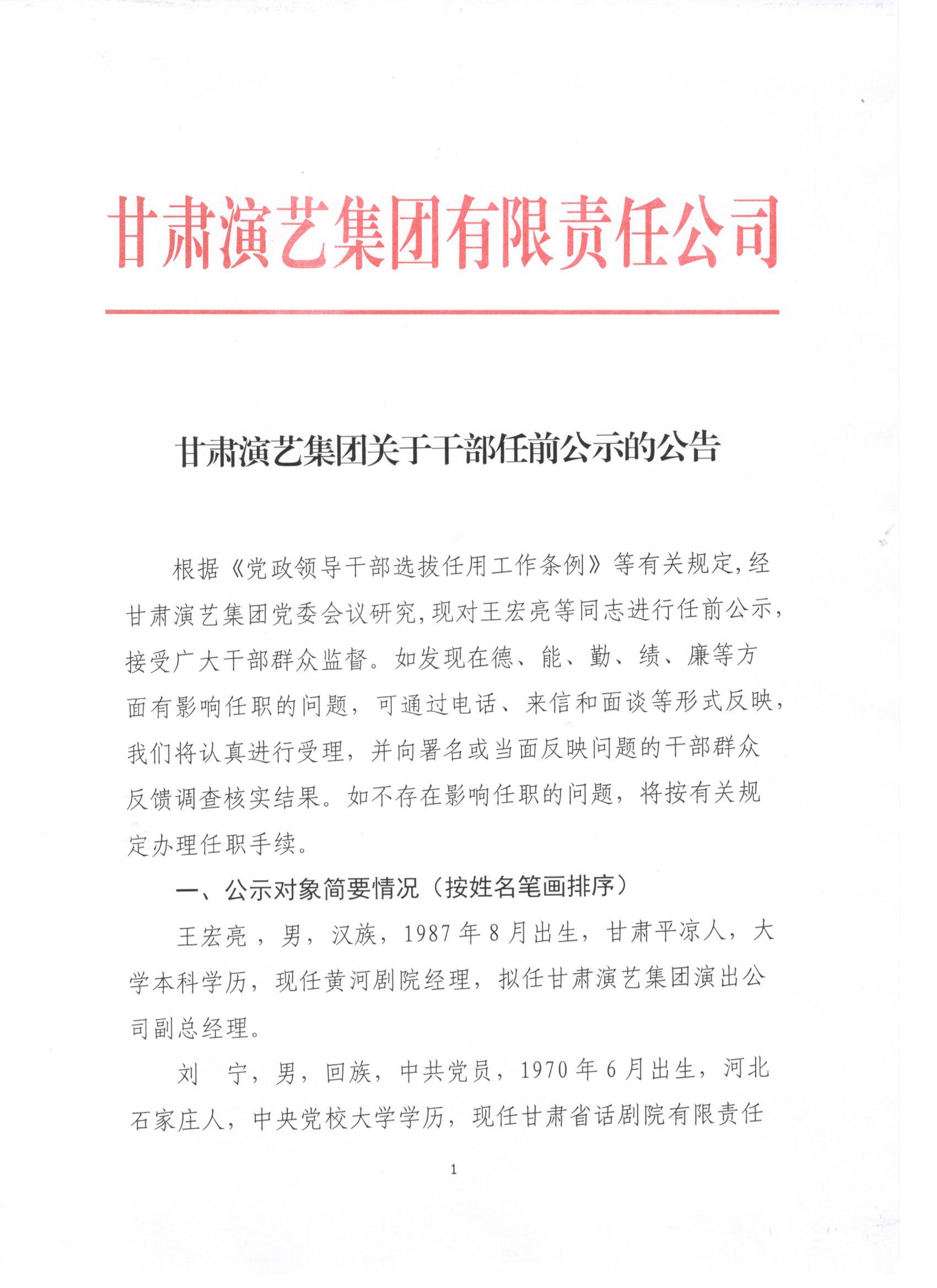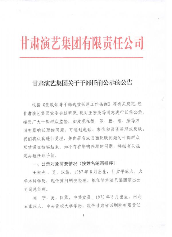 甘肅演藝集團(tuán)關(guān)于干部任前公示的公告